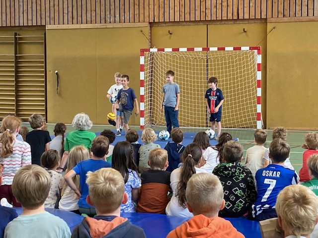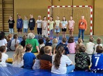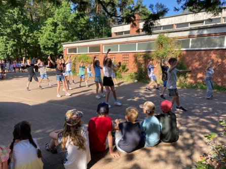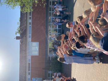 Aber wir konnten bei schönem Sommerwetter immerhin noch einen gemeinsamen Abschluss mit allen Klassen auf dem Schulhof auf die Beine stellen: Die Viertklässler präsentierten den Cup-Song und verabschiedeten sich einzeln mit ein paar individuellen Gedichtzeilen pro Kind.
