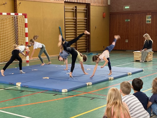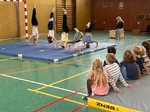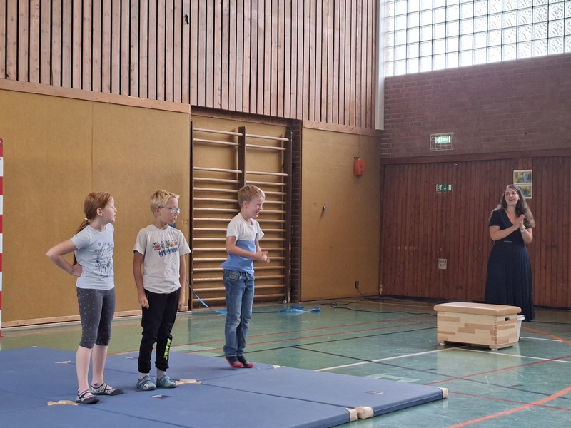Das heißt, der "Sprung" aus dem Flur über einen Schülertisch auf die Weichbodenmatte und der Lauf durch den Spalier aus Schülern und Lehrern.