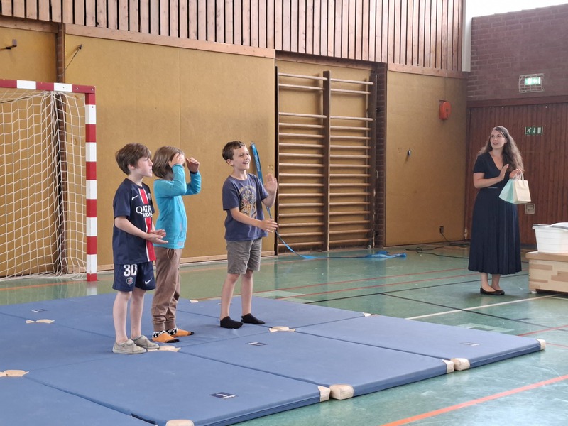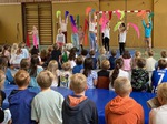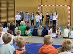 Nach einem fröhlichen Klassentreff mit Picknick am Irenensee, dem bewegenden Abschieds-Gottesdienst in der Ehlershäuser Kirche und einer aufregenden Übernachtung in der Schule wurden unsere ältesten Schülerinnen und Schüler sprichwörtlich "rausgeschmissen": Ein jeder ladete jedoch weich und lachend auf der Weichbodenmatte, um dann wie ein Star durch den Spalier der jüngeren Mitschüler laufen zu können. Danach trugen die Kinder der 4a mit Frau Wendt noch ein selbst gedichtetes Lied vor (46 Strophen, in denen die Viertklässler und das Kollegium der Schule besungen wurden!).
